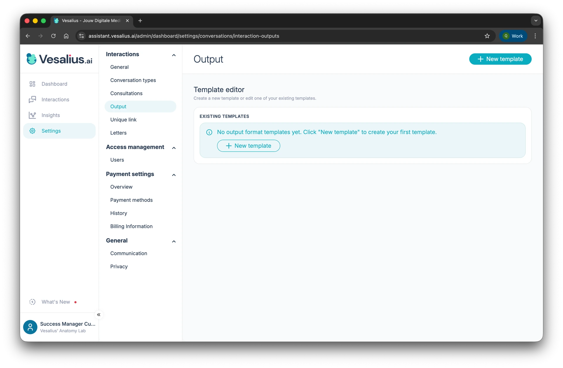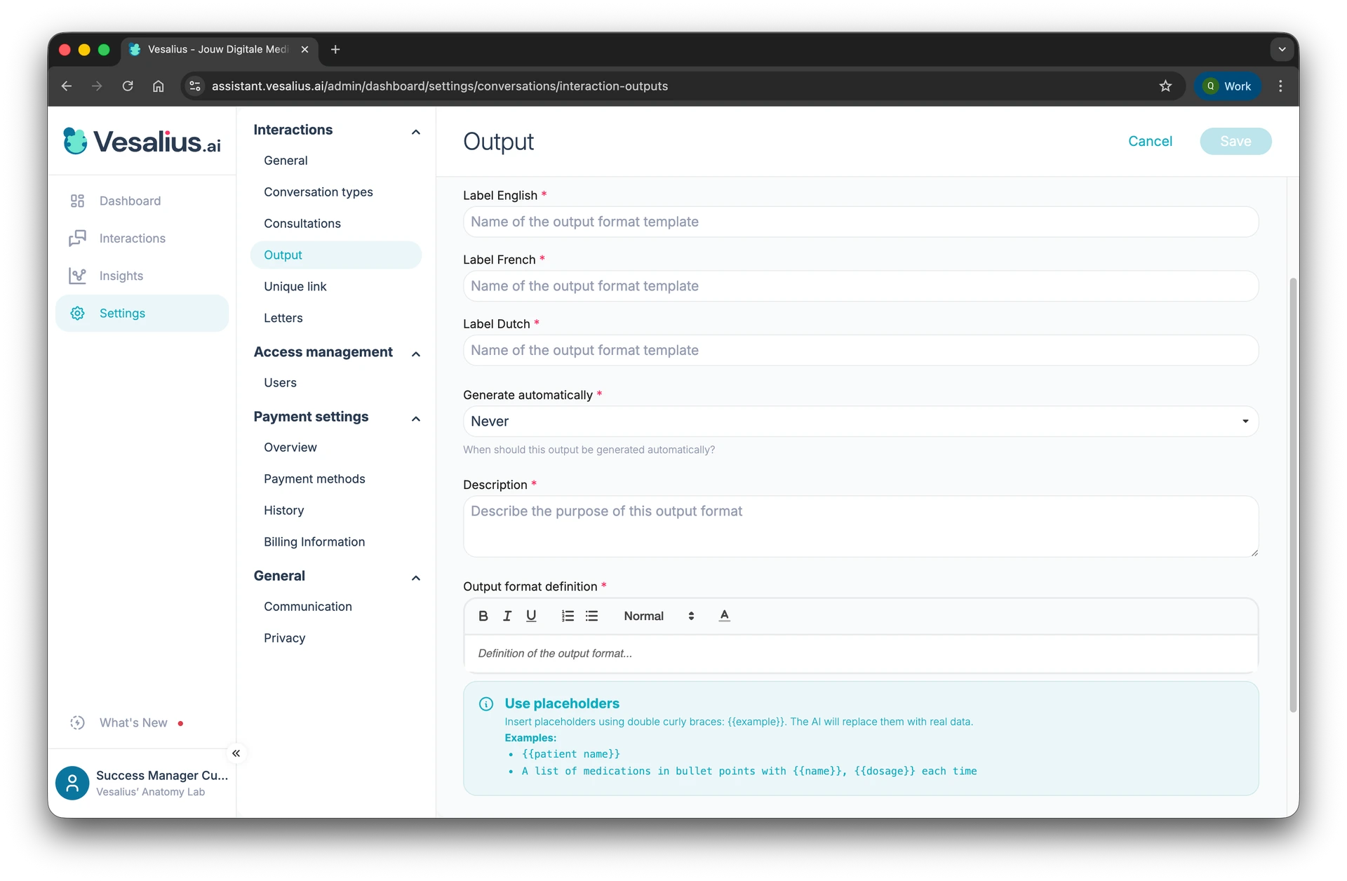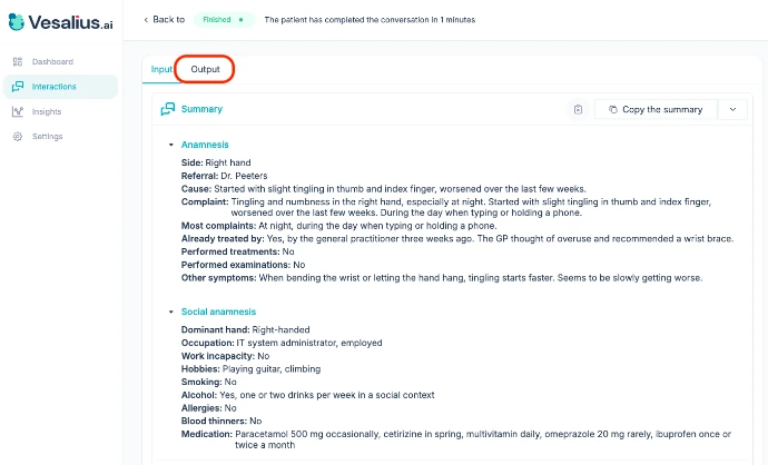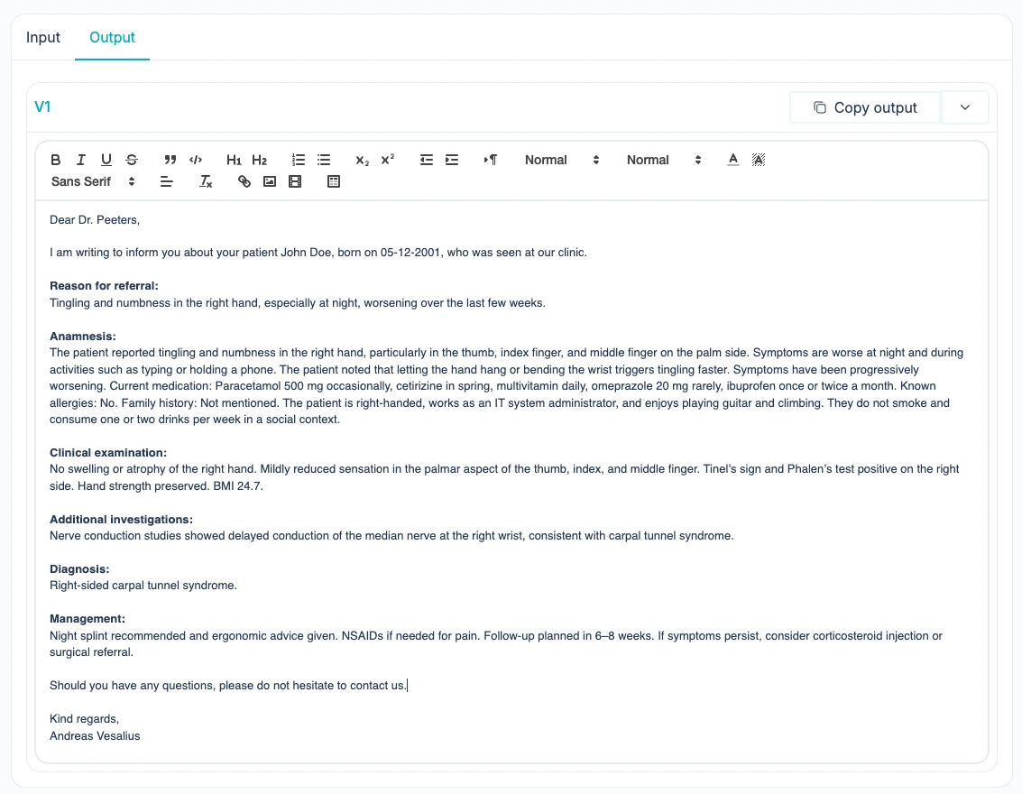 Output templates let you define exactly what Vesalius AI generates after a patient interaction. You configure the structure, content, and timing — and the system handles the rest.