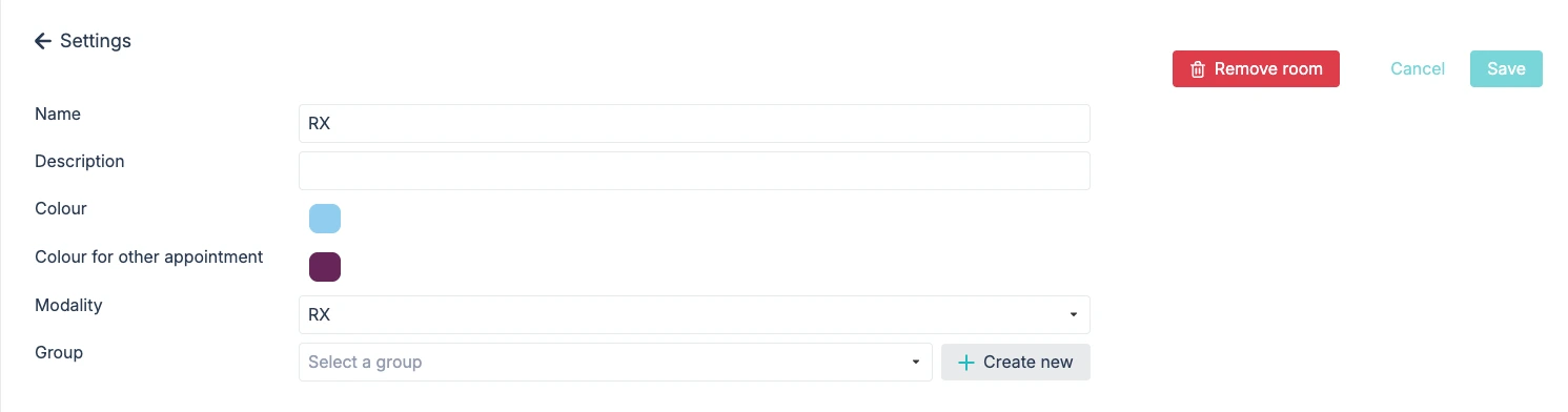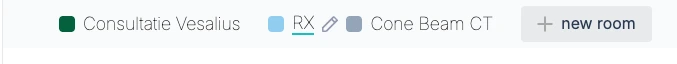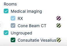 Om je kalender overzichtelijker te maken, kun je gerelateerde kamers samen onderbrengen in een kamergroep. Hieronder zie je hoe de kamers RX en Cone Beam CT bijvoorbeeld gegroepeerd kunnen worden onder Medical Imaging.